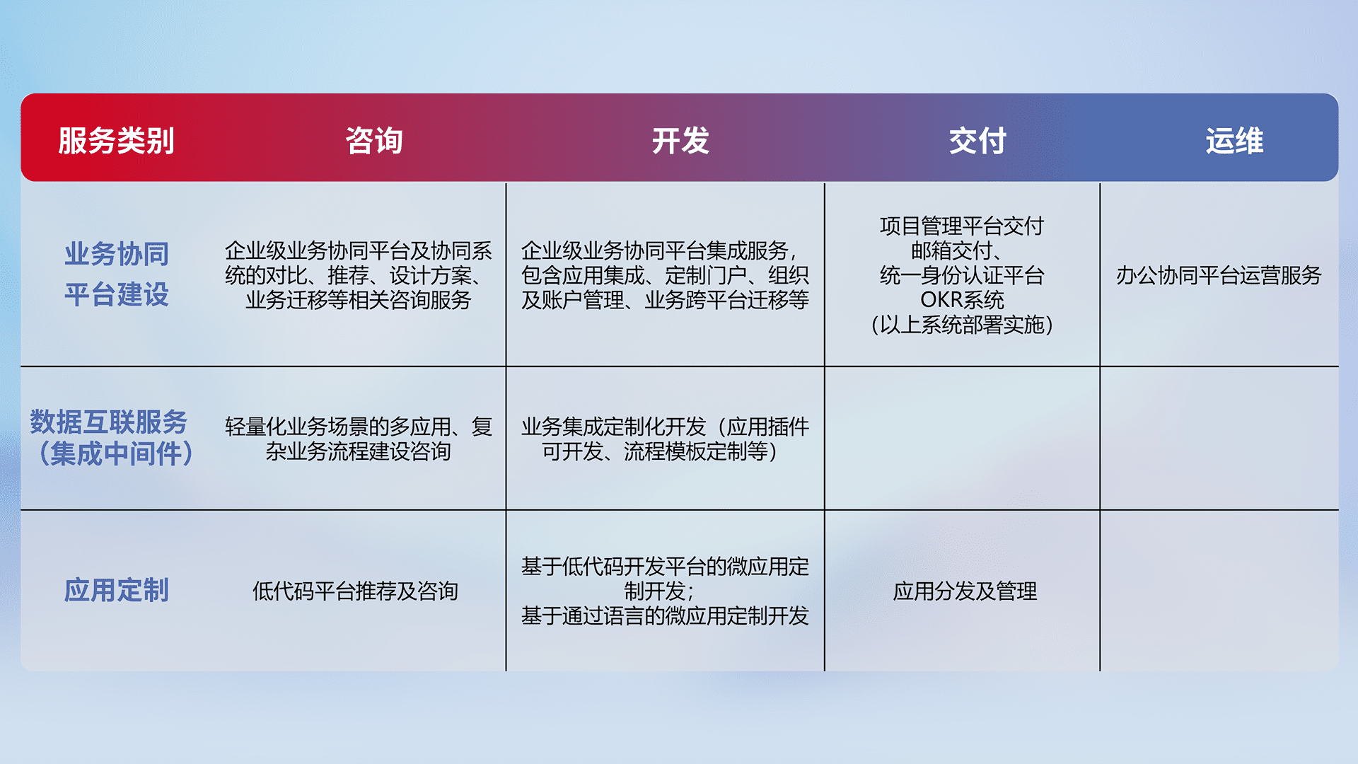 针对钉钉、、、企微、、、IDaas等平台级产品提供产品的规划、、、、方案、、、、交付、、、定制化开发等服务,,,,实现如统一协同办公、、、智能客户服务、、、、混合会议管理、、智能数据查询、、、、等业务场景,,,实现数字化转型。。。。